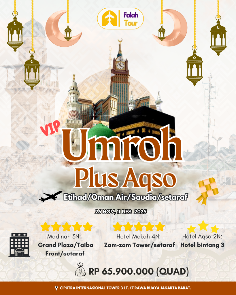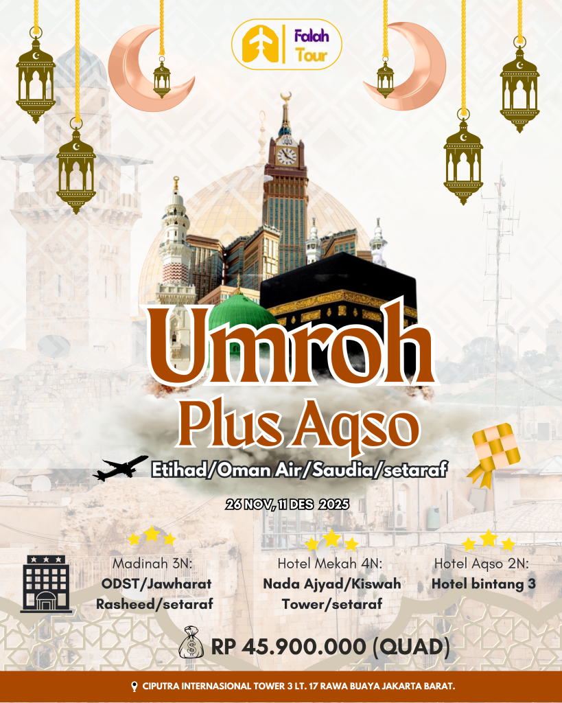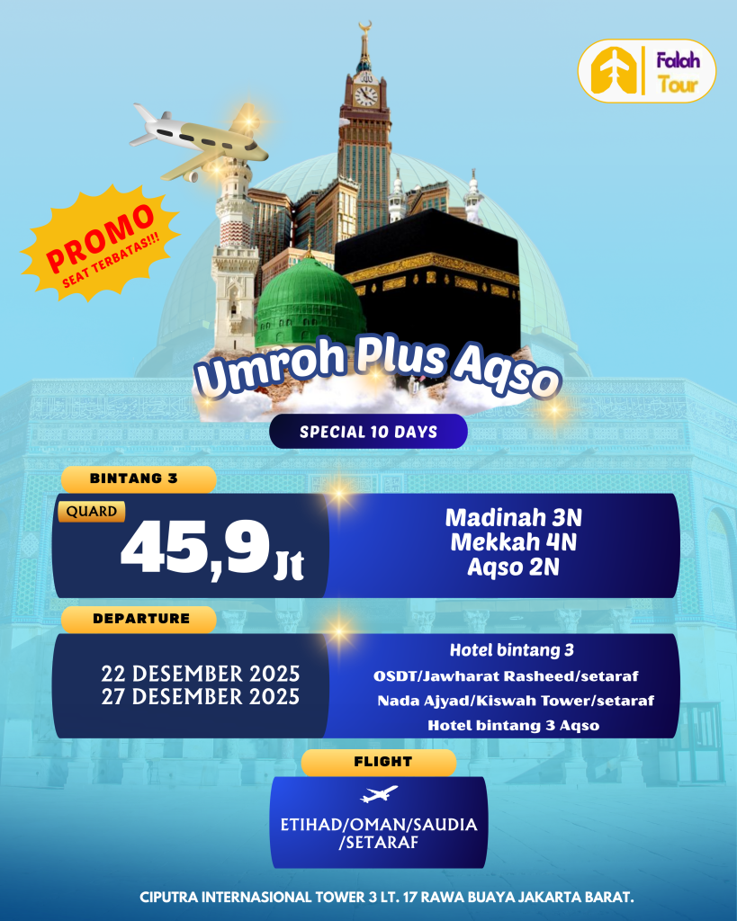 Ibadah umroh adalah bentuk pendekatan spiritual kepada Allah SWT yang penuh berkah dan keutamaan. Namun bagi sebagian jamaah, kesempatan menunaikan ibadah ke Tanah Suci juga menjadi momen untuk menyusuri jejak-jejak sejarah Islam yang lebih luas. Salah satunya adalah melalui paket Umroh Plus Aqsa — perpaduan antara umroh di Makkah dan Madinah, serta ziarah ke Masjidil Aqsa di Yerusalem, hotel Jerusalem, kiblat pertama umat Islam & masjid ketiga tersuci setelah Masjidil Haram & Masjid Nabawi, juga mengunjungi masjid, mengunjungi jabal tsur jabal rahmah.