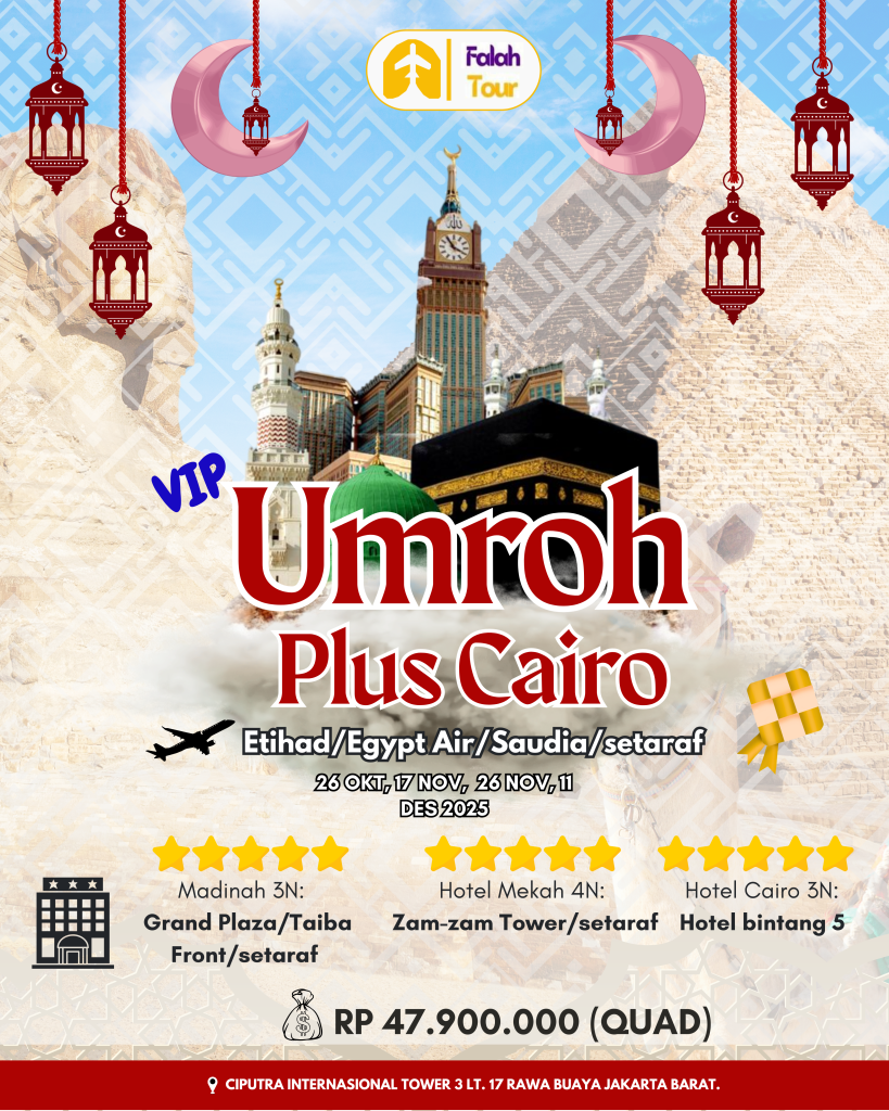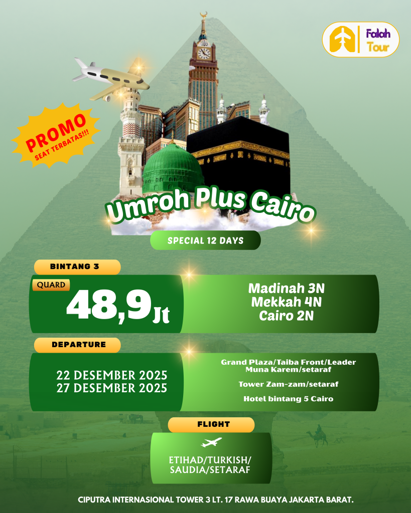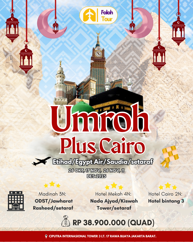 Umroh adalah perjalanan spiritual yang sangat didambakan umat Islam di seluruh dunia. Namun kini, semakin banyak jamaah memilih paket Umroh + Cairo – sebuah perjalanan yang tidak hanya mencakup ibadah umroh di Tanah Suci, tetapi wisata sejarah Islam di Mesir, negeri para nabi dan jejak sejarah kuno. Dengan menggabungkan unsur imaniah dan edukatif, Umroh+Cairo menawarkan pengalaman yang lebih mendalam dan bermakna.