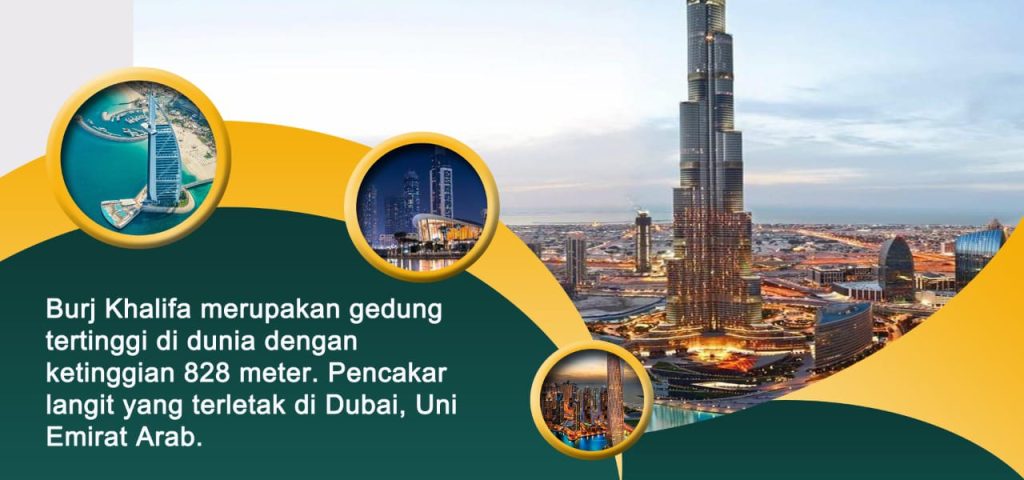 - Burj Khalifa: Gedung tertinggi di dunia (828 meter), dengan observasi deck yang menyajikan pemandangan kota dari ketinggian.